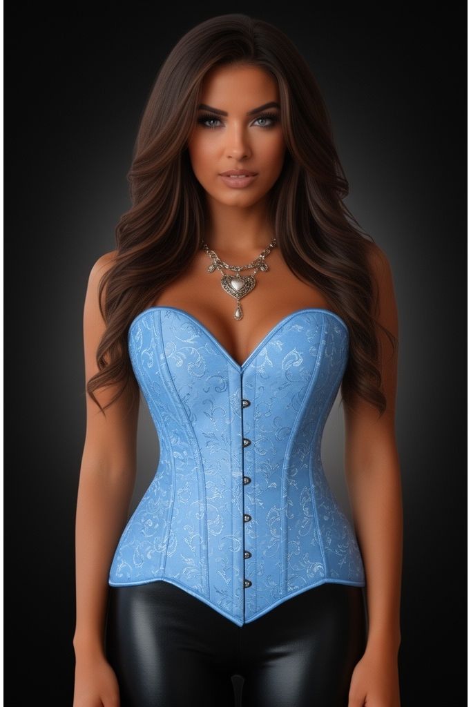 Lavish Lt Blue Brocade Overbust Corset W/Busk Closure