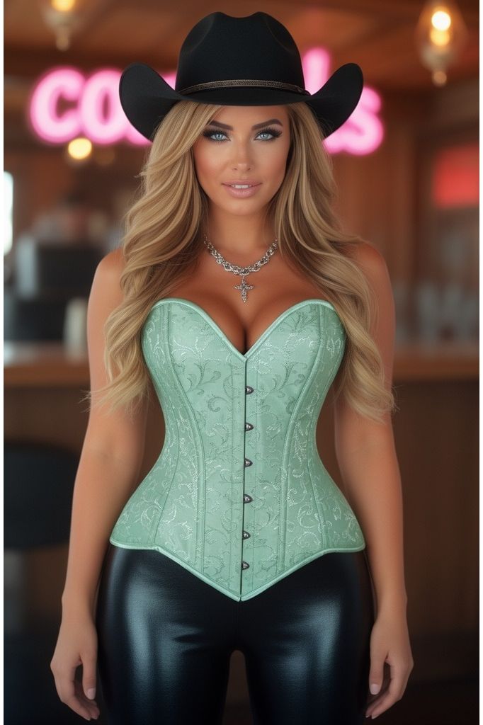 Lavish Mint Green Brocade Overbust Corset W/Busk Closure