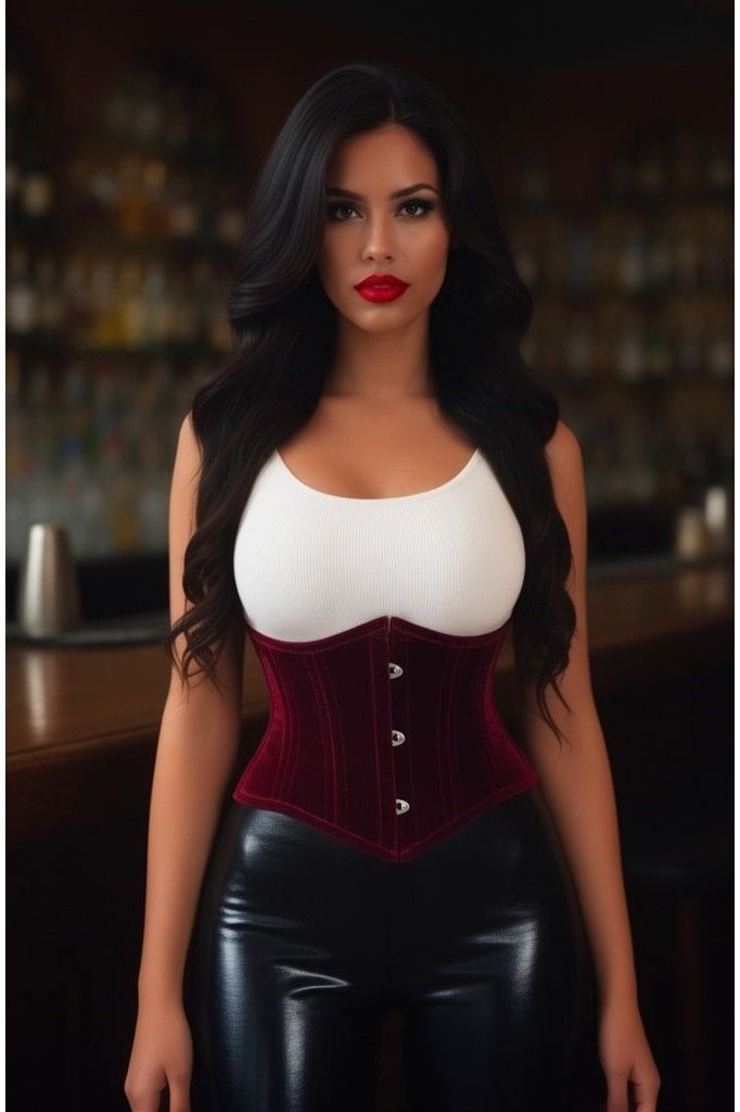 Turn up the drama with this striking dark red velvet waist mini cincher corset, perfect for lingerie, gothic fashion, Halloween costumes, cosplay, burlesque, and bold everyday style. Featuring a front busk closure for easy wear, this corset is fully boned to provide strong waist shaping and a dramatic hourglass silhouette. The adjustable lace-up back with privacy panel allows for a comfortable and customizable fit, while garter loops offer styling versatility with stockings. Whether worn over clothing as a statement accessory or as part of a costume, this corset delivers both structure and style. This mini cincher style is perfect for layering over clothing to accentuate your waist, creating a fun halloween costume or gothic look, or with a bra and panty set for bedroom wear.
