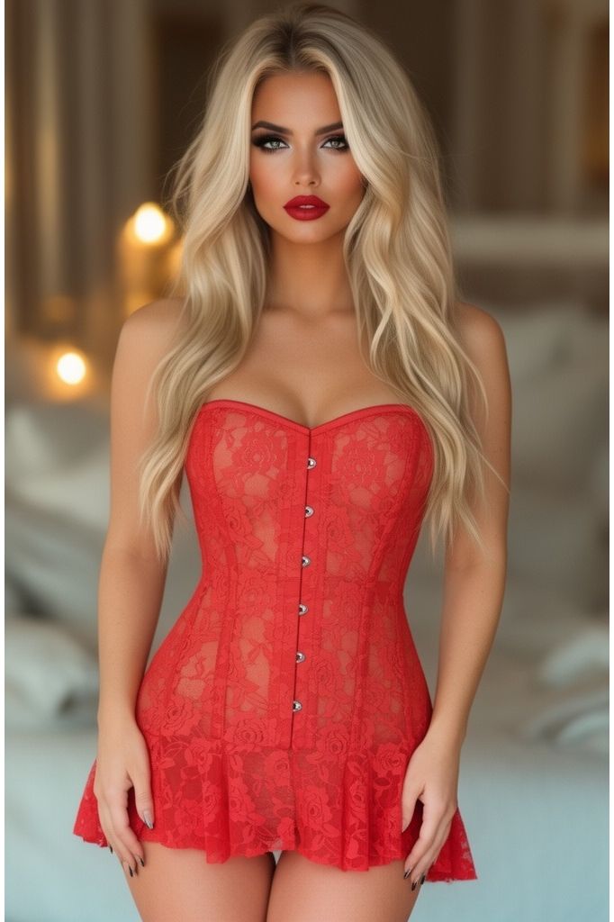 Indulge in the ultimate expression of romance with our Lavish Red Sheer Lace Corset Dress. This exquisite piece is crafted from the finest quality lace, delicately hugging your curves and accentuating your feminine figure. The corset features 8 plastic bones and 4 static steel back and front boning, providing both support and structure. The front busk closure adds a touch of elegance, while the nickel brass grommets and thick cording in the back allow for a perfect cinched fit. This dress is truly a work of art, meant to be treasured and adored. Dry clean only to maintain its luxurious quality. From Daisy Corsets USA, where beauty and sophistication meet.